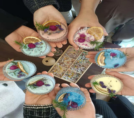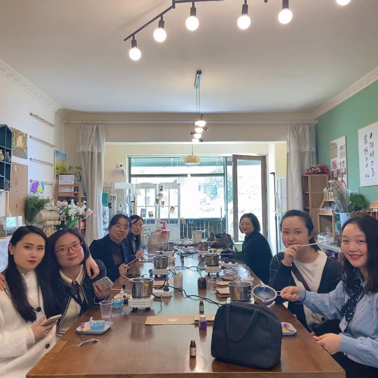 當(dāng)大家看到桌子上有各種材料及鍋具,十分好奇,都躍躍欲試?,F(xiàn)場由3位手工老師指導(dǎo)大家從香薰選擇、顏色搭配、最后到融蠟開始。